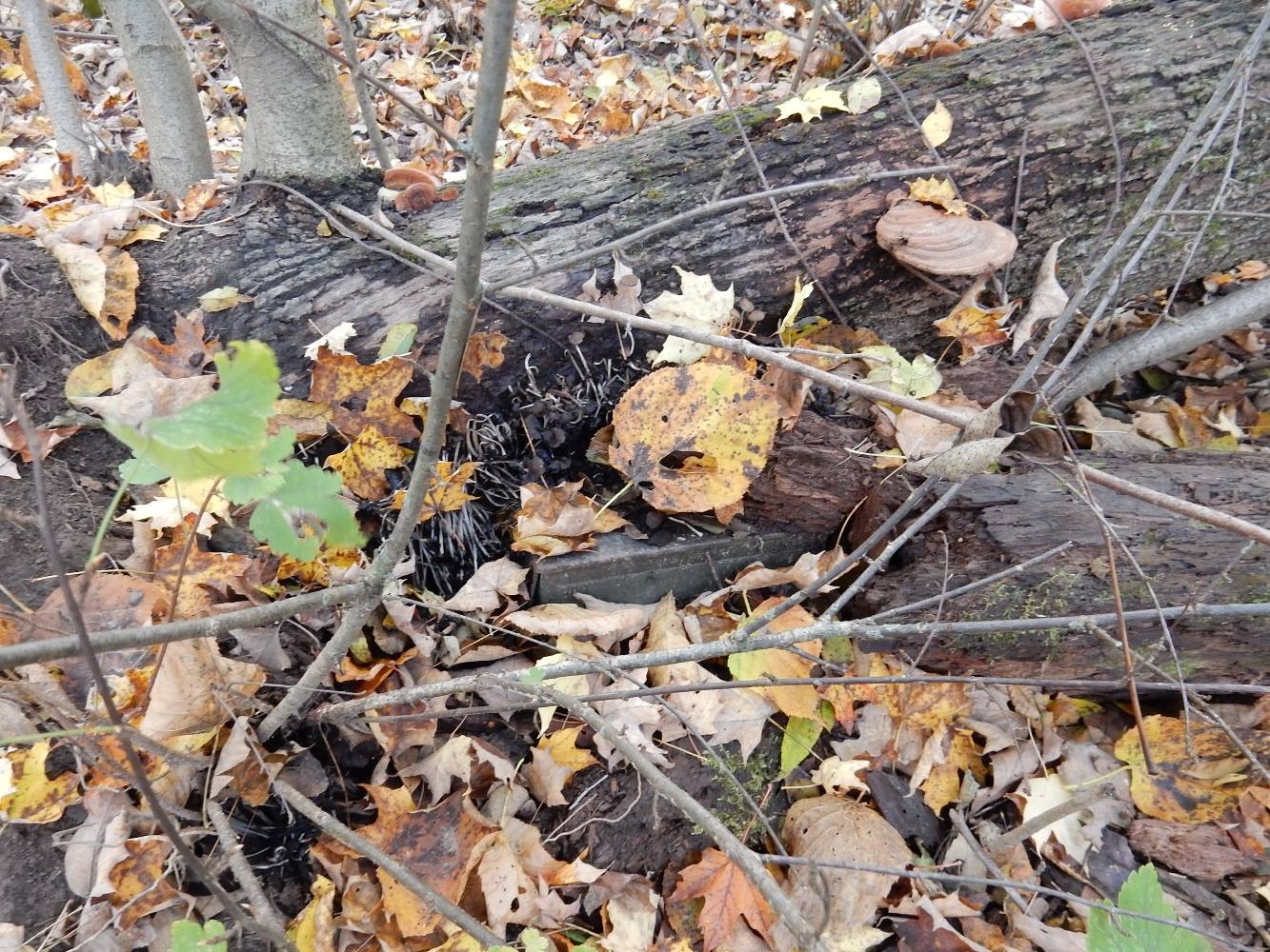 When we reached the posted coordinates, there was the cache, an ammo box partially buried in compost but visible, and not too far off the trail. Opened it up and found it to be in great shape and fully stocked. A little damp, but much better than expected given the elapsed time since it was last opened.