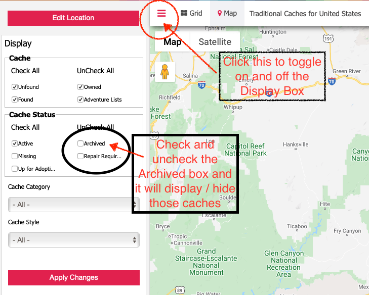 - make archived caches hidden on the map by default. That way they wouldn't be confused with active caches by those less familiar with the map features. You have to intentionally 'turn them on' to view them.